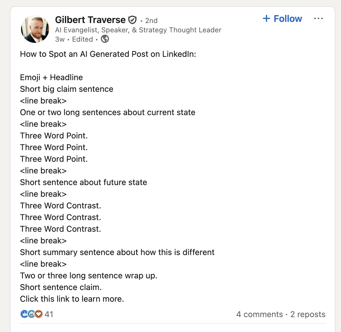 As people keep on using AI to make dumb three-sectioned LinkedIn posts (punchy header, bullet point facts, state solution, do it three times)